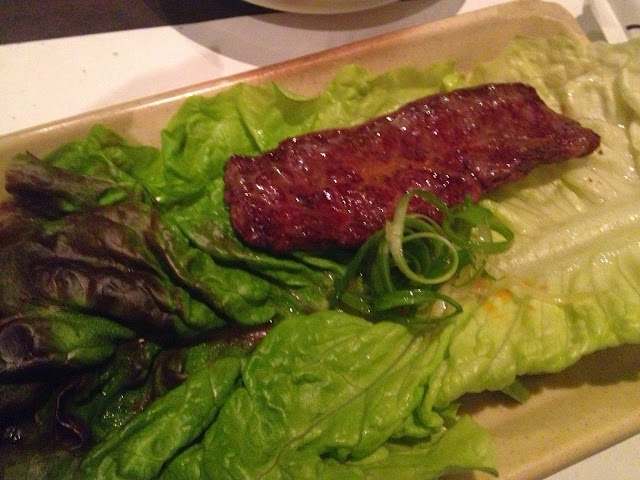 It was my priority to order some galbi and bulgogi, since I find these meats delicious and my family always orders this. As soon as the galbi (short rib) was brought to the table, both our mouths started to water. As soon as our waiter began grilling the galbi, R and I were very eager to dig in. At one point, with the smell of the galbi wafting towards him, R had the biggest grin on his face. I snapped a picture and it's probably my favorite one of him that I have. Traditionally, galbi is wrapped in lettuce, covered with a spicy sauce, and eaten. I was more than excited for my galbi lettuce wrap.