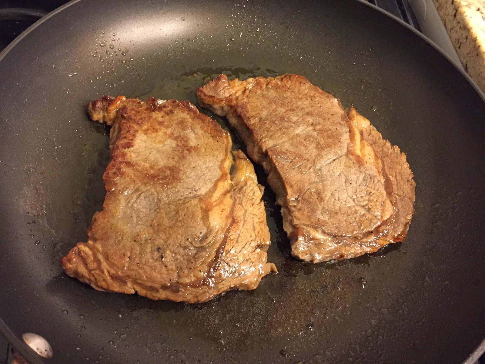 R seasoning the steak with salt, pepper, onion powder, garlic powder, red wine, and soy sauce